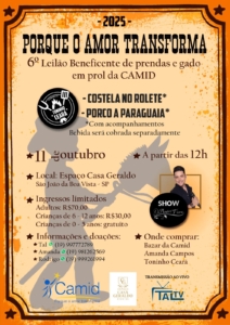 No dia 11 de outubro, a partir das 12h, acontece o 6º Leilão Beneficente de prendas e gado em prol da CAMID - Casa de Apoio ao Menor Irmã Dulce, em São João da Boa Vista/SP. 👉 Além do leilão, teremos um delicioso almoço com Costela no Rolete e Porco à Paraguaia (com acompanhamentos), e show especial com André Fiora.…